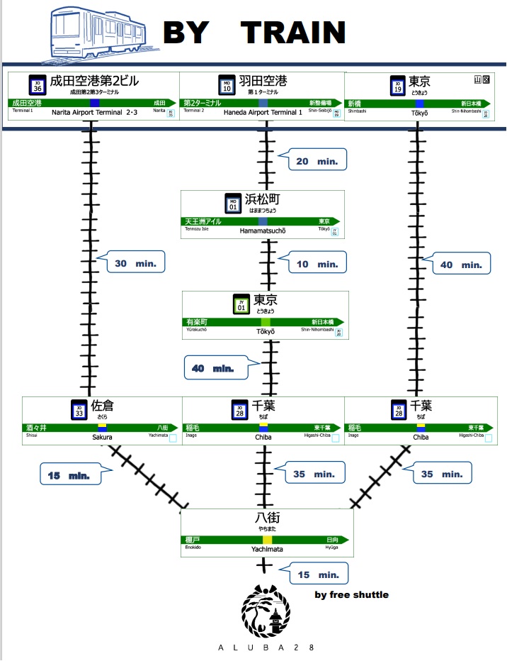 ※ Free shuttle service from Yachimata Station to ALUBA28 takes about 15 minutes.